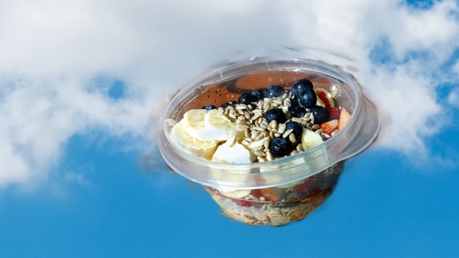 In the morning drain. Chop bananas, add in the mix. Add blueberries and strawberries and sunflowers seeds or chopped walnuts. Add a splash of almond milk to complete and serve