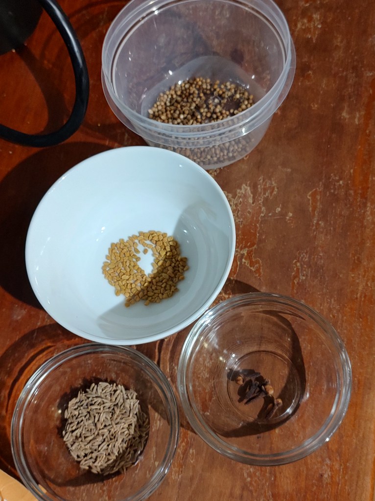 Add 3 cloves and blend all together again. add 5 whole black peppercorns, half tbs. of fenugreek seeds, 1 tbs. Green Cardamom and blend.