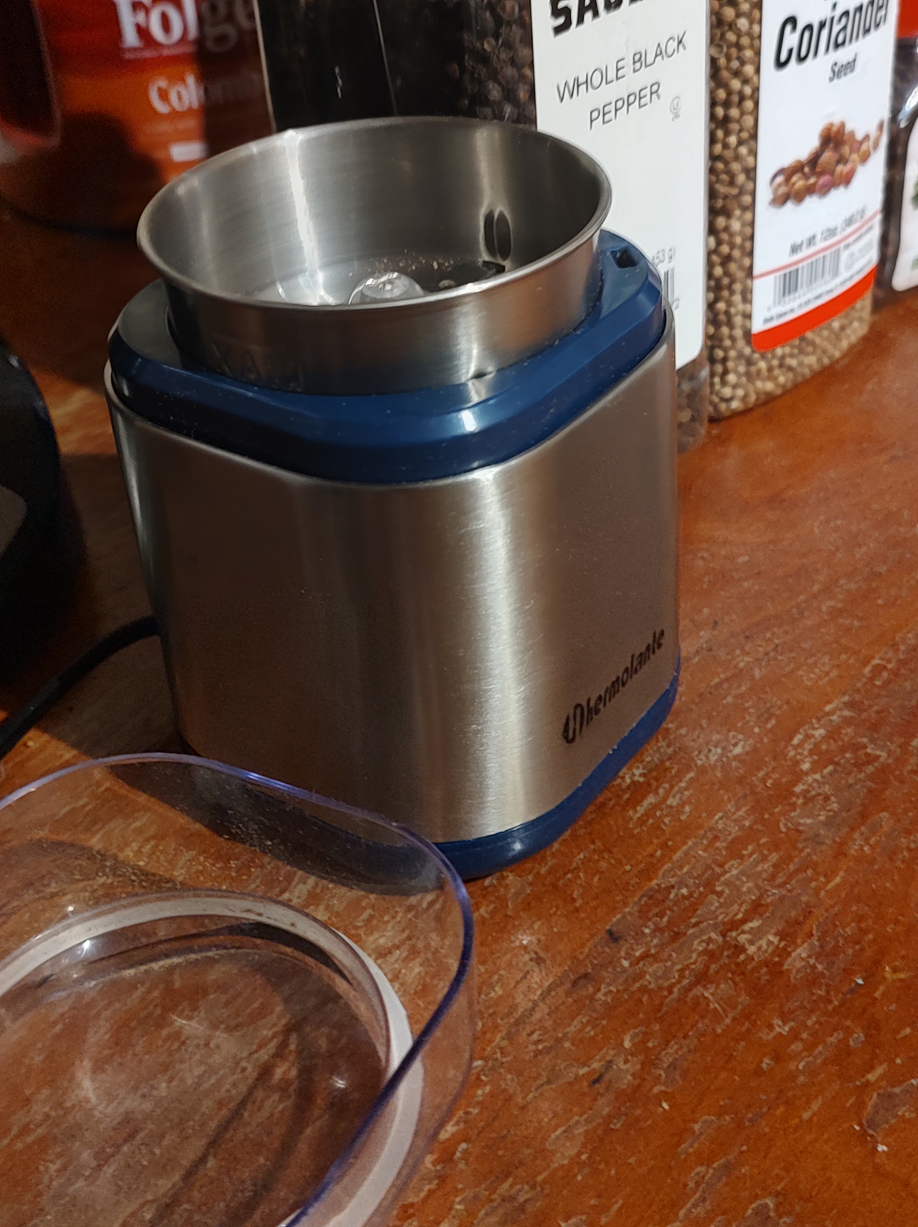 Place 1 tbs. of cumin seeds in the seed grinder and blend. Add 1 tbs. of Coriander seeds and blend more.