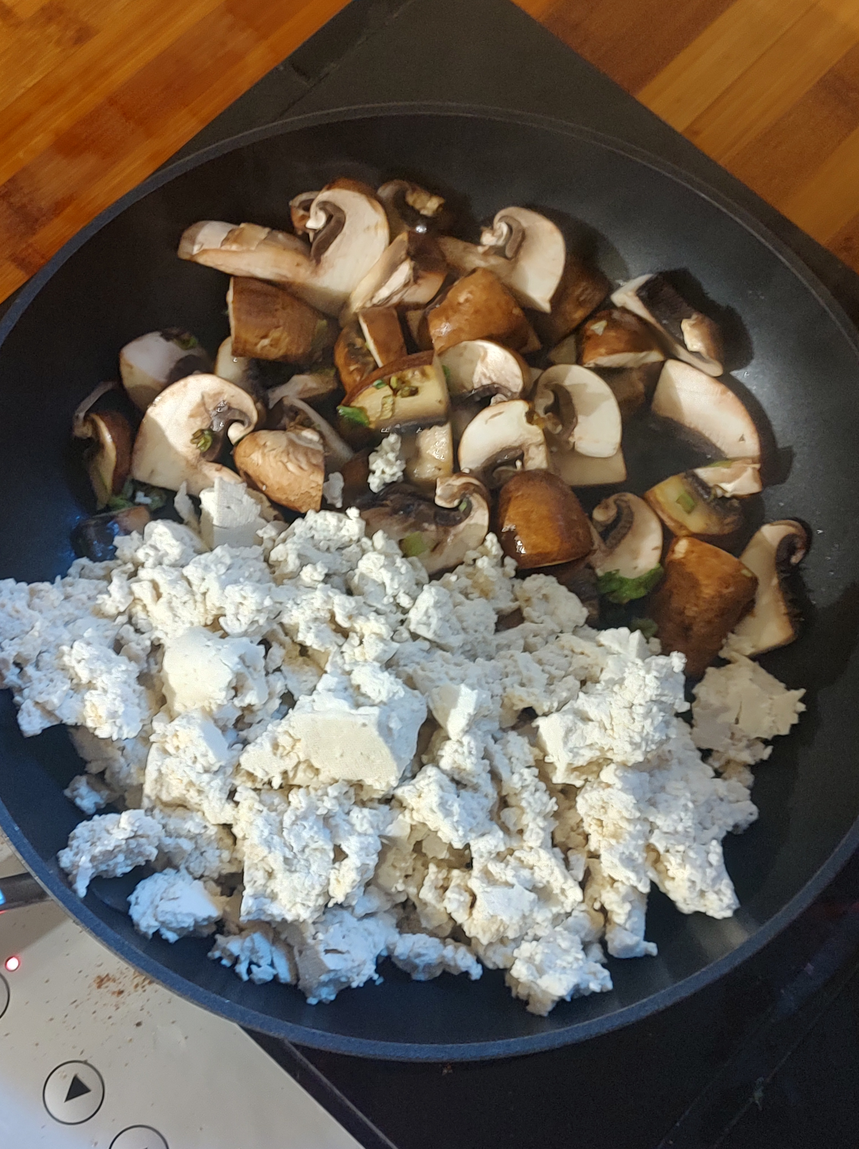 Heat a frying pan and add 1-2 tsps olive oil. Chop some green onion and mushrooms to saute in the pan. Have ready 1 container of tofu pressed out in a towel or tofu presser. It should be dry and firm tofu.